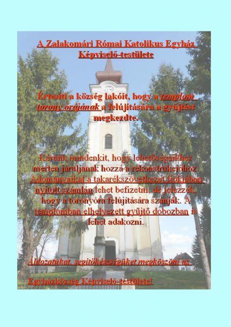 2011.01.20. Képviselő-testületünk döntött a Templomunk hosszú ideje nem működő torony órájának a fejújítására irányuló gyűjtés megkezdéséről. Adományokat a bejáratnál elhelyezett gyűjtődobozban és a takarékszövetkezetben nyitott számlán lehet megtenni, de jelezzék az adomány célját. Áldozatvállalásukkal Önök is hozzájárulnak, hogy újra harangszóval mutassa az időt büszkeségünk, Templomunk tornya.